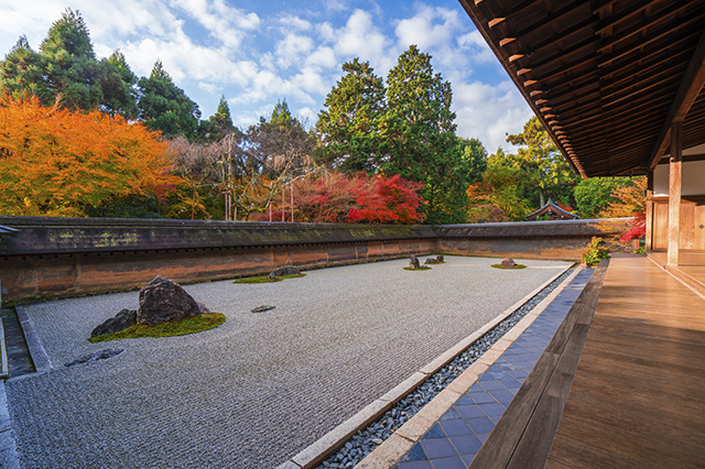 Đền Ryoan – ji nằm ở phía tây bắc Kyoto. Trong tiếng Nhật Ryoan – ji có nghĩa là đền thờ Rồng trong hoà bình. Ngôi đền này được xây dựng vào năm 1450. Khu vườn ban đầu có 9 viên đá lớn tượng trưng cho con hổ qua sông, ngày nay với 15 viên đá, có rất nhiều ý nghĩa khác nhau đối với khu vườn.